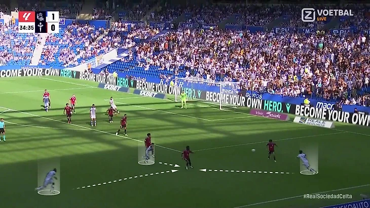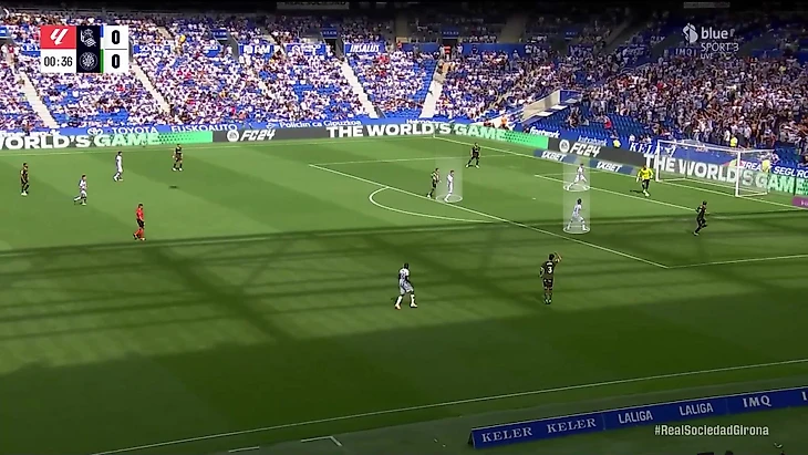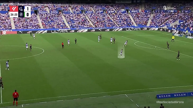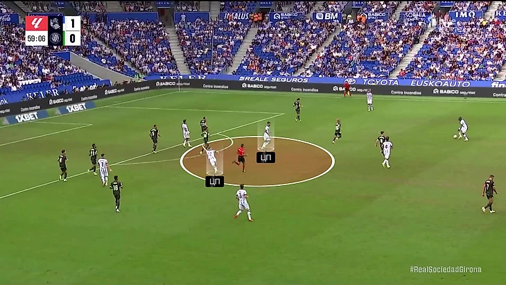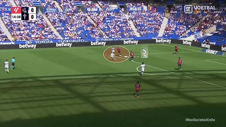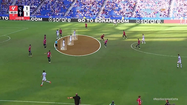 В этих позиционных ротациях ключевой элемент – заполнение чужой опорной зоны. «Сосьедад» стремится создавать там равенство или преимущество. Как правило, держит двух футболистов, но персоналии постоянно меняются.
