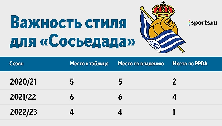 «Реал Сосьедад» разделяет стилистические ценности большинства топ-клубов – они всегда высоко по параметрам, которые отражают контроль матчей и смелость. Конечно, побеждать можно в любом стиле, но в таком лучше прогрессируют и ярче себя показывают игроки. При этом в последние сезоны стиль дополняется еврокубковыми местами: