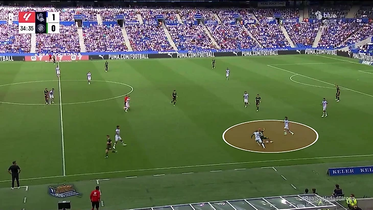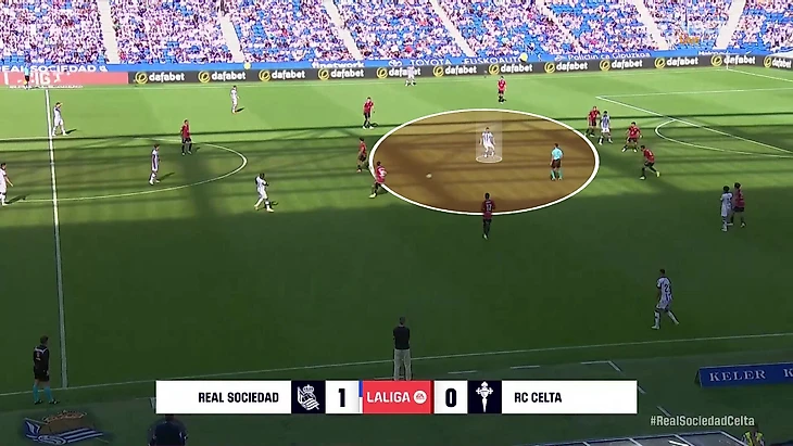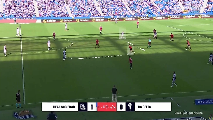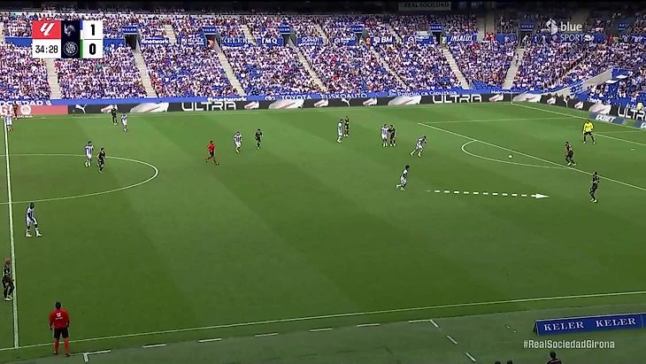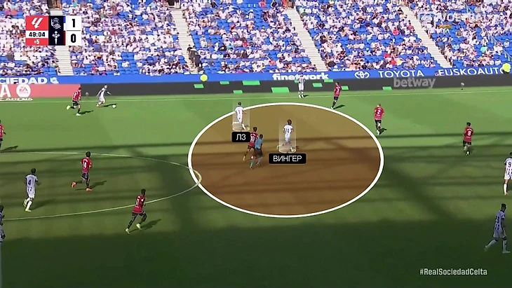Это рискованный подход. С одной стороны, он способствует не просто давлению с целью вынудить ошибку, а буквально провоцирует отборы. С другой, если соперник выберется из-под волны прессинга, то рождается атака против разбитой схемы «Сосьедада». Но чаще такие риски приводят к возвратам – игроки хорошо читают эпизоды.