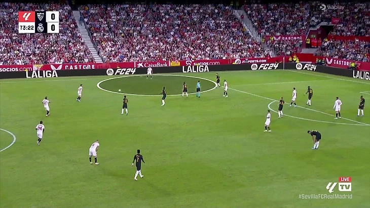 Вот расклад перед голом «Севильи» в последнем туре. Команда переходила на 4-4-2 при обороне, но Лука Модрич банально не успел сесть в схему: