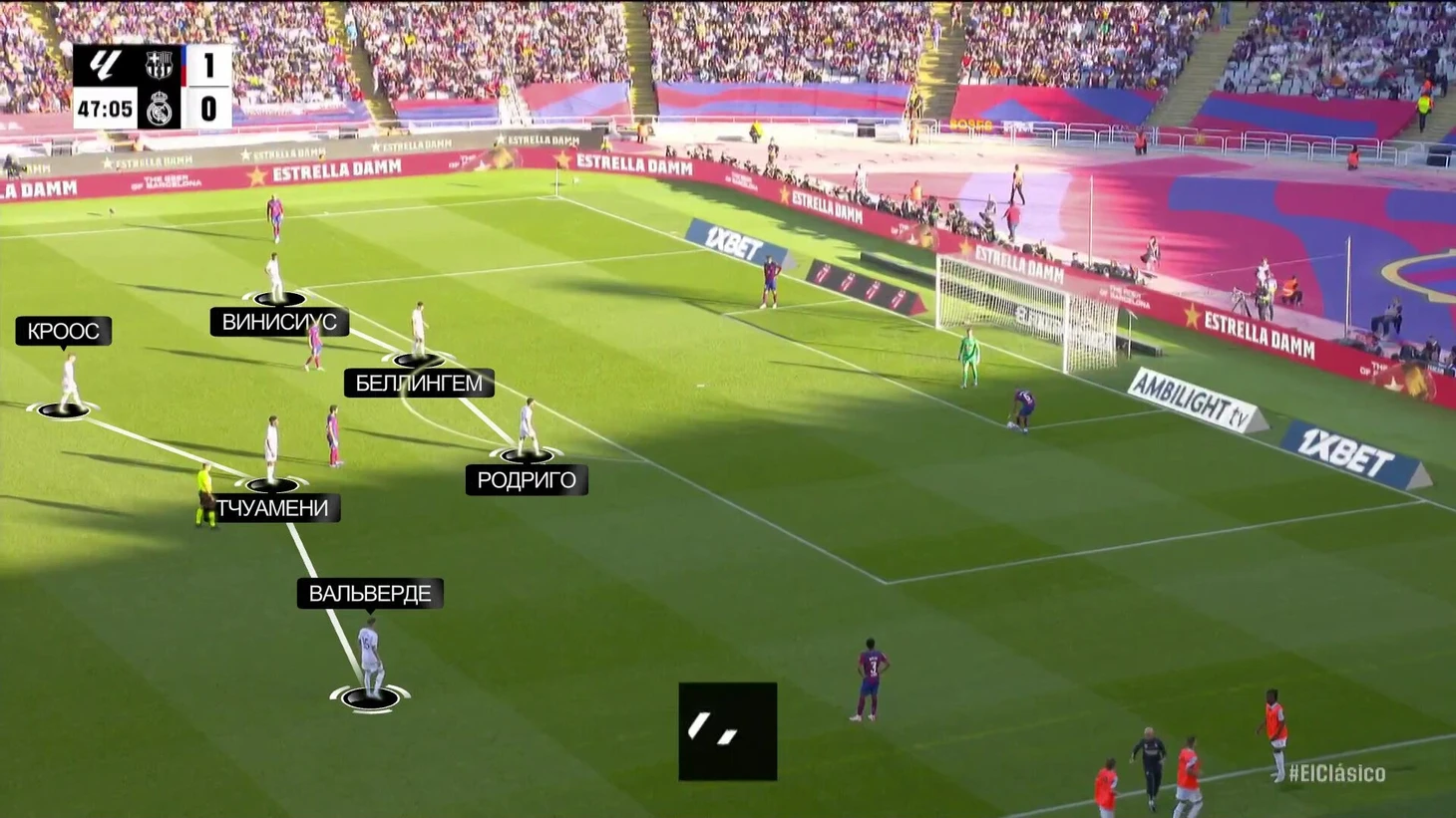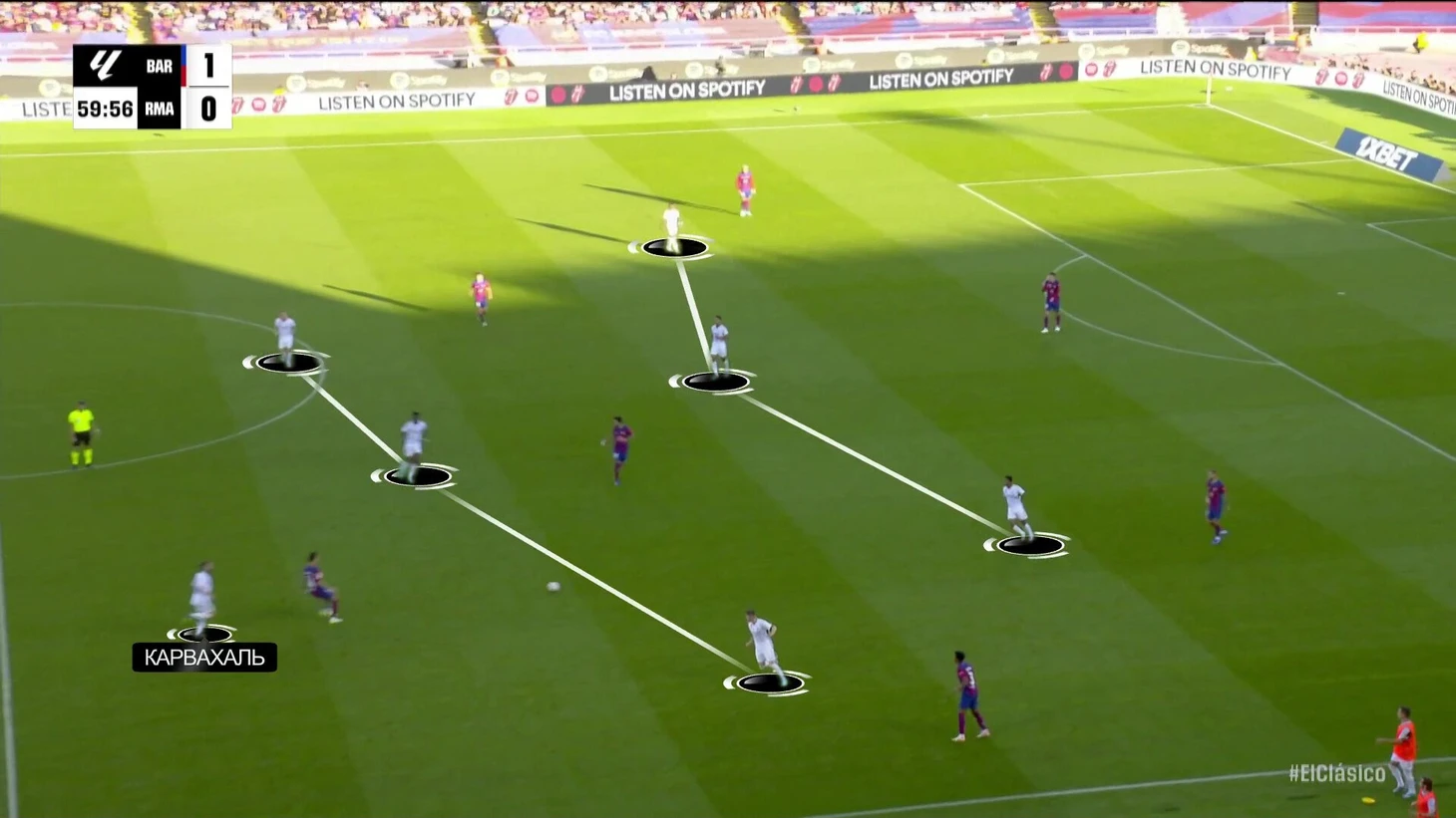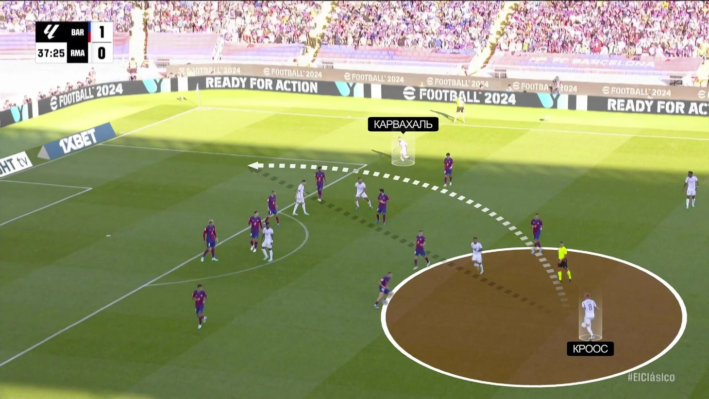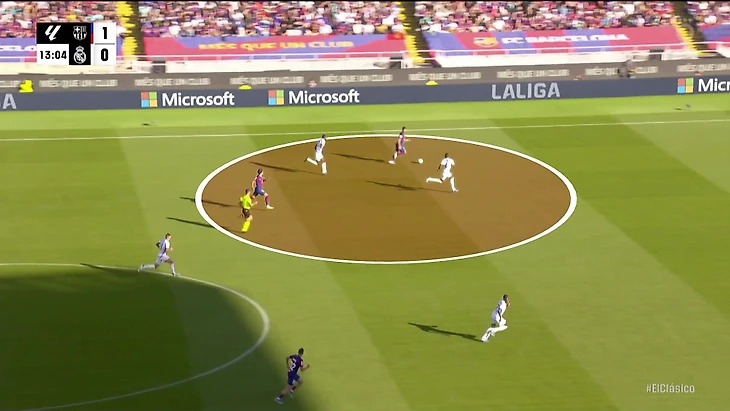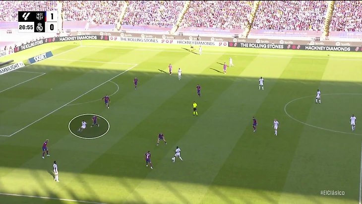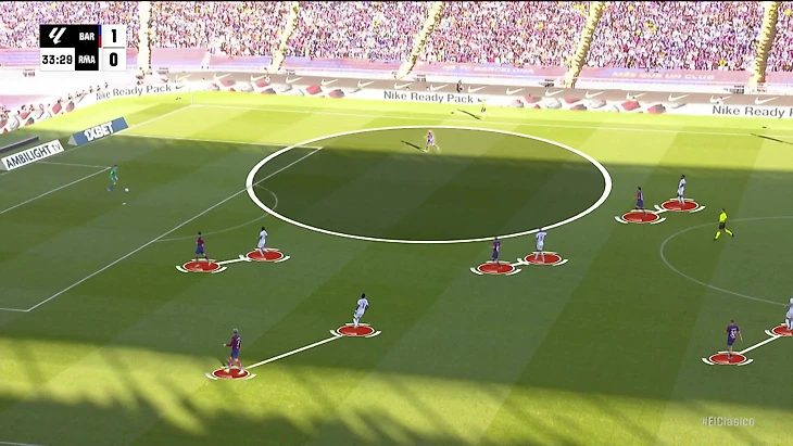 К перерыву команды подошли с хорошей взаимной нейтрализацией, но при счете в пользу «Барсы» на протяжении почти всего тайма. «Реал Мадрид» смотрелся невыгодно, хотя многие аспекты стартового плана Анчи работали – просто задачи изменились не в его пользу. Итальянец отреагировал уже в перерыве.