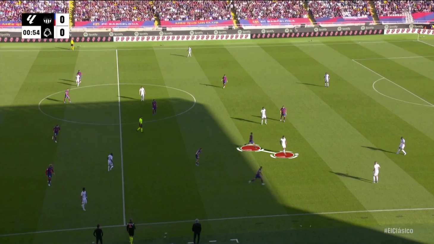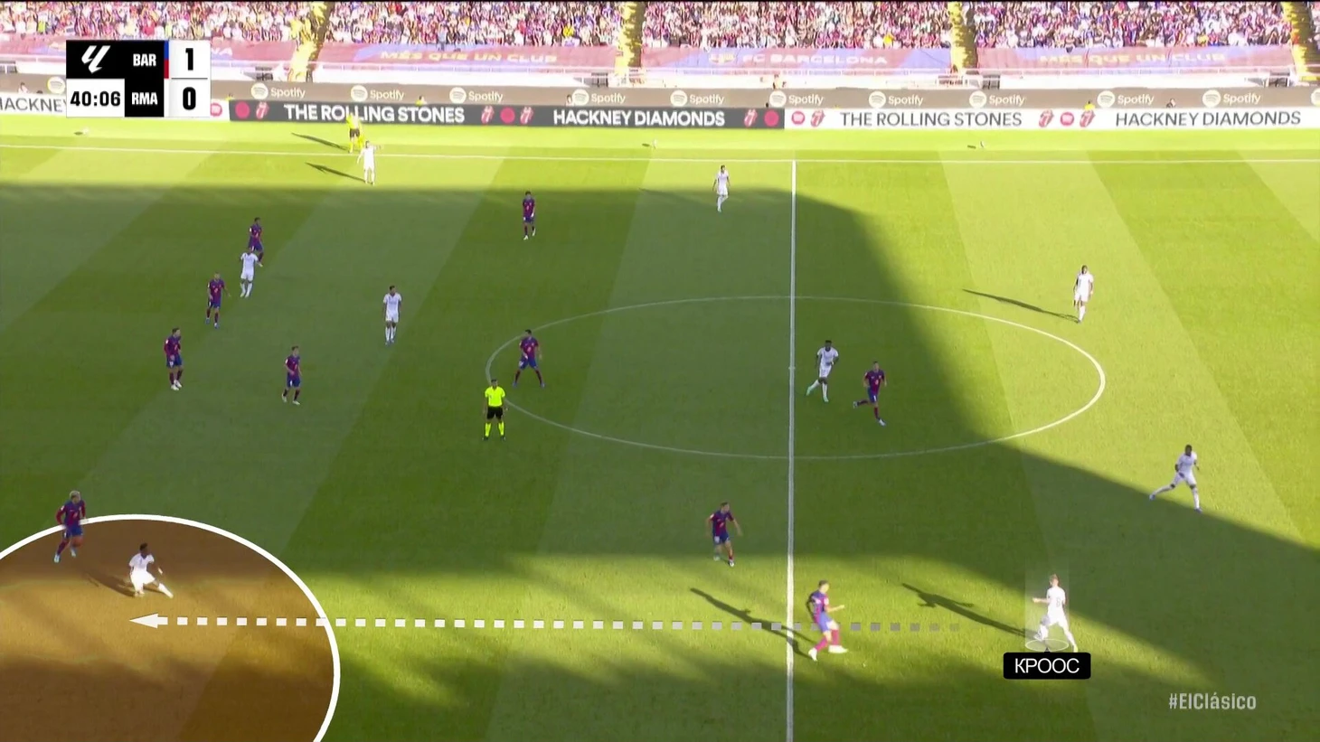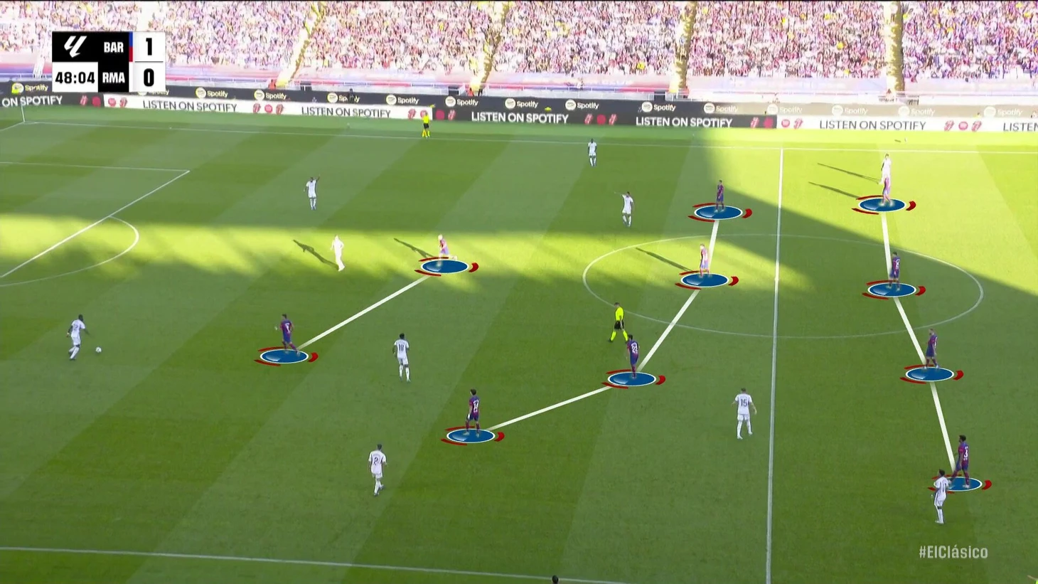 К перерыву команды подошли с хорошей взаимной нейтрализацией, но при счете в пользу «Барсы» на протяжении почти всего тайма. «Реал Мадрид» смотрелся невыгодно, хотя многие аспекты стартового плана Анчи работали – просто задачи изменились не в его пользу. Итальянец отреагировал уже в перерыве.