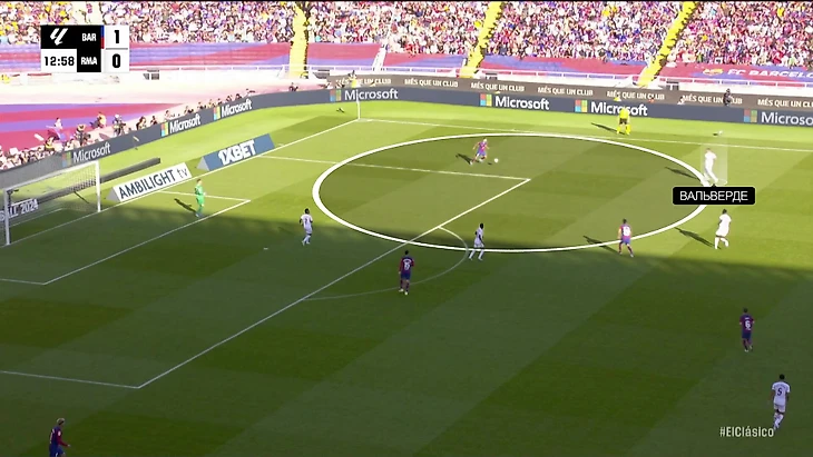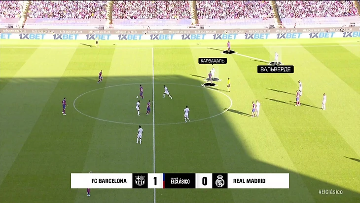 При обороне «Реал» садился в схему 5-4-1 с Вальверде справа в защите. Феде опускался в эту зону не ситуативно (такое бывает в обычных матчах), а постоянно. Следовательно, его стартовую позицию нужно было прикрывать – туда спускался Родриго: