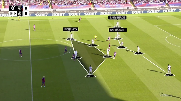 Первое изменение – настройки прессинга. Теперь тройку защитников «Барсы» накрывали Винисиус, Беллингем и Родриго, а Кроос и Тчуамени играли по опорникам: