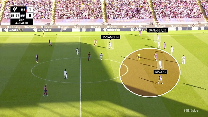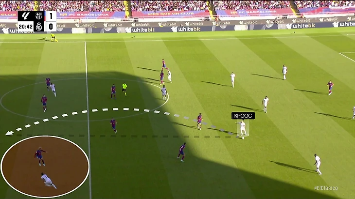 Здесь Кроос получил время на подготовку паса, так как мяч только что перешел к «Реалу» – вырезал с левой в любимую зону Винисиуса: