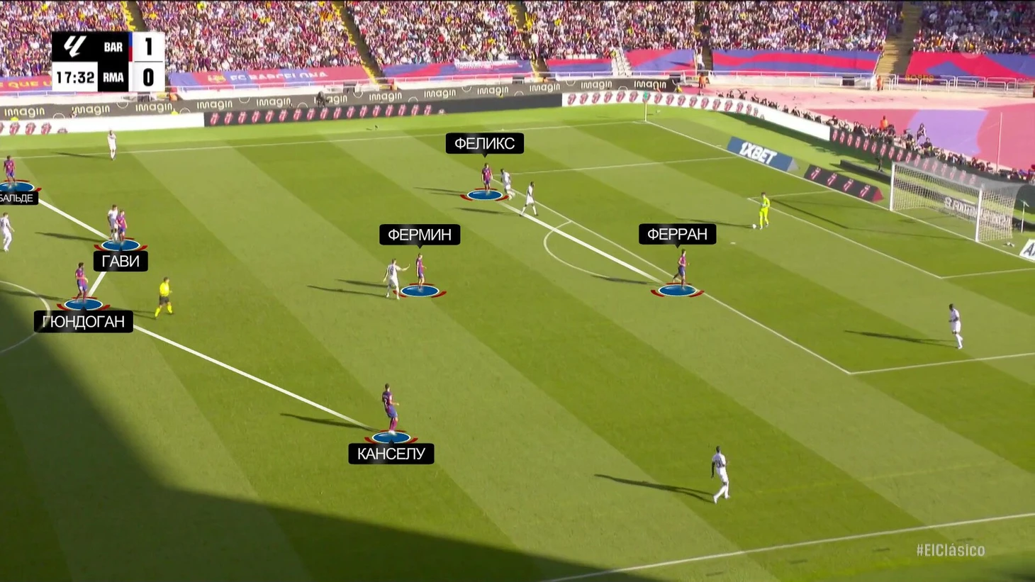 Прямым оппонентом Беллингема в персональной дуэли стал Гави (ниже разберем подробнее). Против Винисиуса плотно играл Араухо. Для этого пришлось изменить позицию Канселу справа и позицию Гави в центре (опорником при обороне мог быть Гюндоган или Ромеу, а Гави играл бы выше).