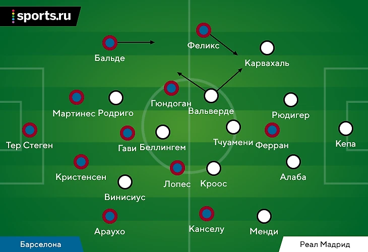 ● Оба тренера преобразовали схему – сделали ее более оборонительной. У Анчелотти это касалось лишь ролей игроков (особенно Феде Вальверде). Хави потребовалось выставить совсем неожиданный состав;