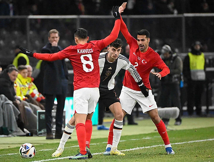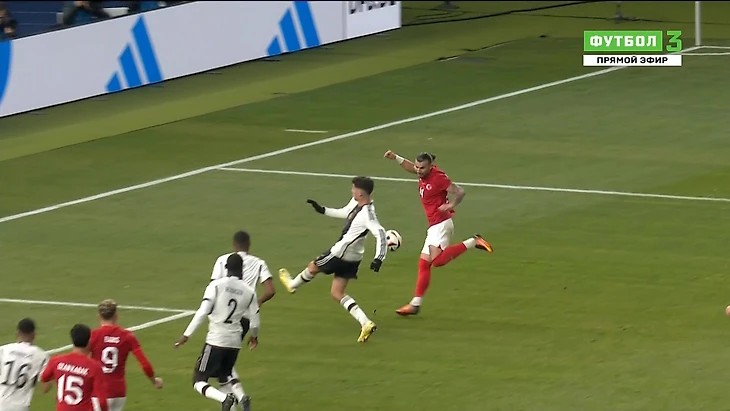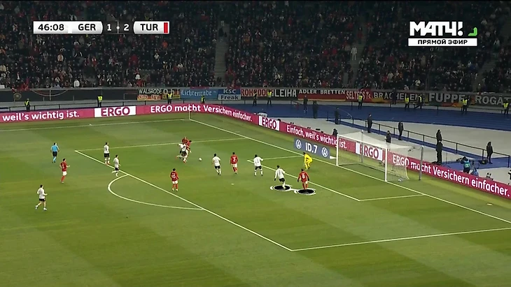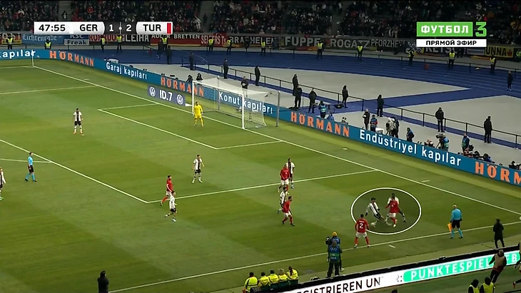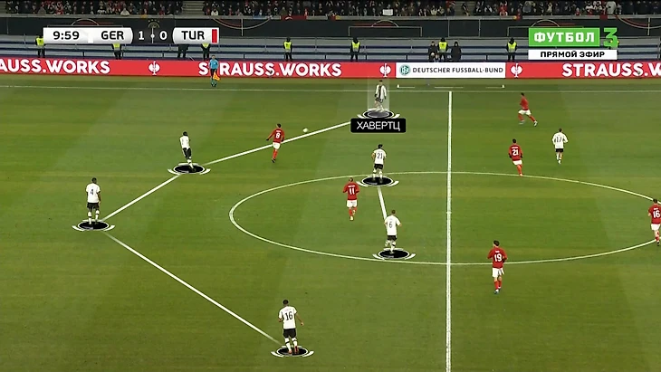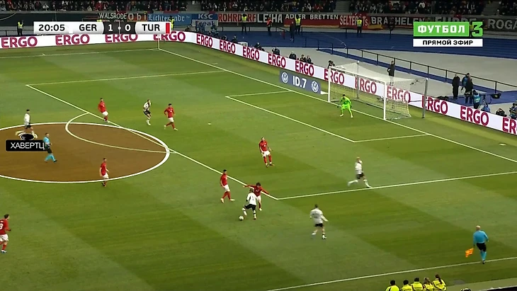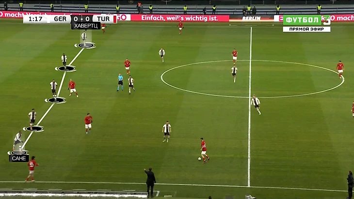 ● В целом фланг не проседал. Больше угрозы Турция создавала с противоположной стороны. У Хавертца почти не было позиционных ошибок – особенно по меркам игрока, который вообще не играл в этой роли. Но он весьма забавно выглядел, пытаясь отбирать мяч, когда оказывался близко к сопернику – банально не хватало базовых навыков: