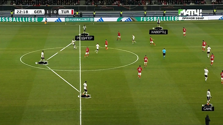 В эпизодах, где такая помощь под прессингом не требовалась, Хавертц открывался в широкой позиции слева – она была почти зеркальной расположению Лероя Сане на правой бровке. Ближе всех к зоне левого защитника в такие моменты оказывался Антонио Рюдигер: