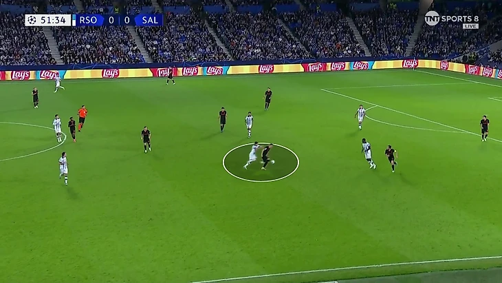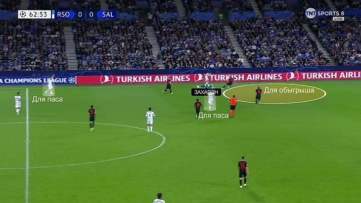 Именно в этой зоне Арсен получал мяч, когда «Сосьедад» выбирал его направление. Как правило, у футболиста этой роли есть две опции: играть на сохранение (пас назад или в середину) или обыгрывать 1-в-1 (в основном за счет скорости). Варианта для обострения сразу с фланга почти никогда не было.
