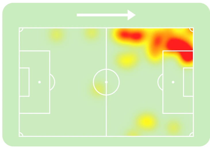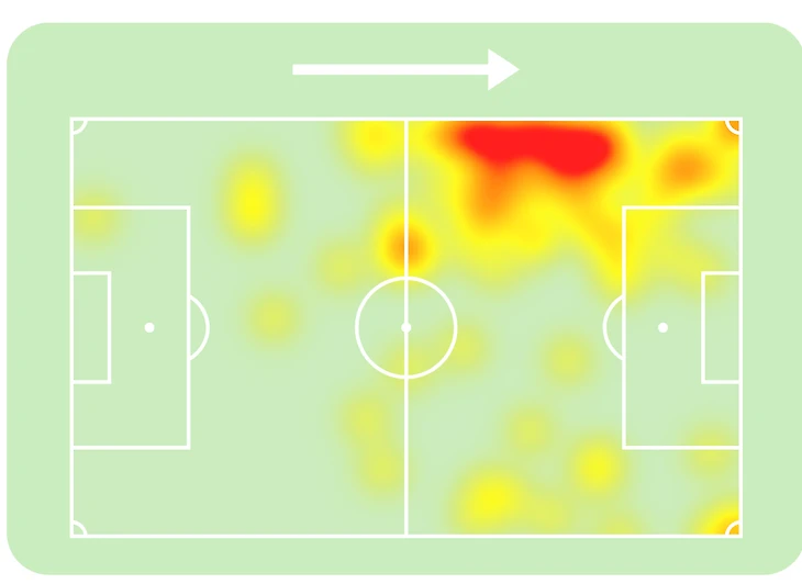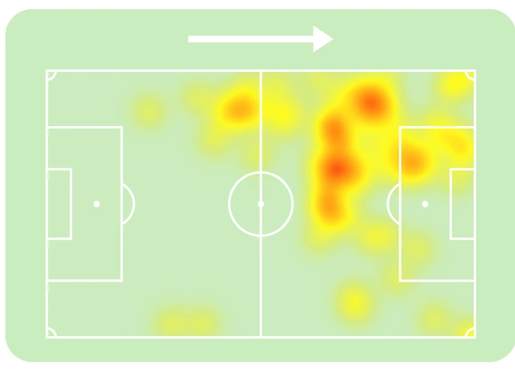 На карте есть некоторые признаки активности в других зонах – это связано с редкими действиями после стандартов (он часто подавал) и с финальной тридцатиминуткой, которую он провел на другой позиции (об этом ниже). Но именно стартовая роль предполагала чудовищную фланговую закованность.
