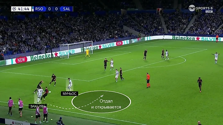 Несколько примеров упущенных возможностей. Здесь Захарян пробует стеночку с Муньосом – со своей стороны исполнил качественно (заметил рывок, удобно отдал, открывался в свободную зону). Вместо возврата Айен потеряет мяч: