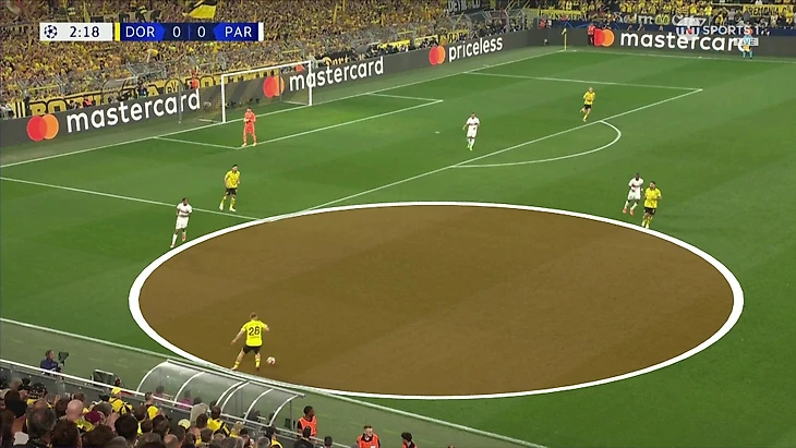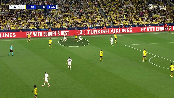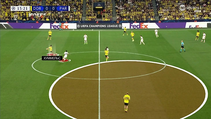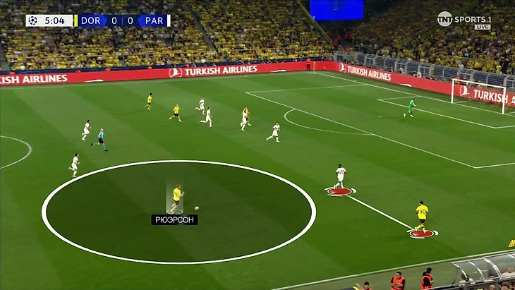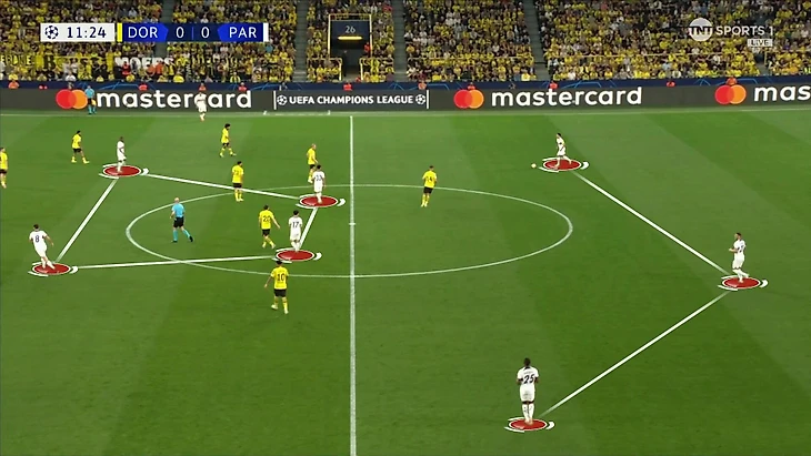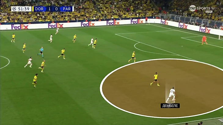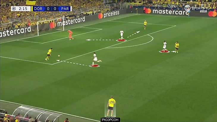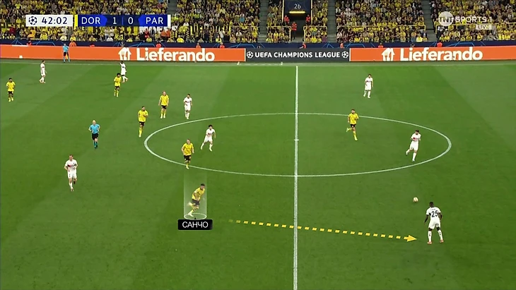 Формально в центре 4-в-3 в пользу «ПСЖ». Цель «Дортмунда» – не позволить пасовать в этом направлении. Формула – выжидание в рамках компактной схемы 4-1-4-1 + ситуативные выдвижения на игрока с мячом, которые не переходили в командное давление. Это приводило к бесконечным перепасовкам без угрозы.