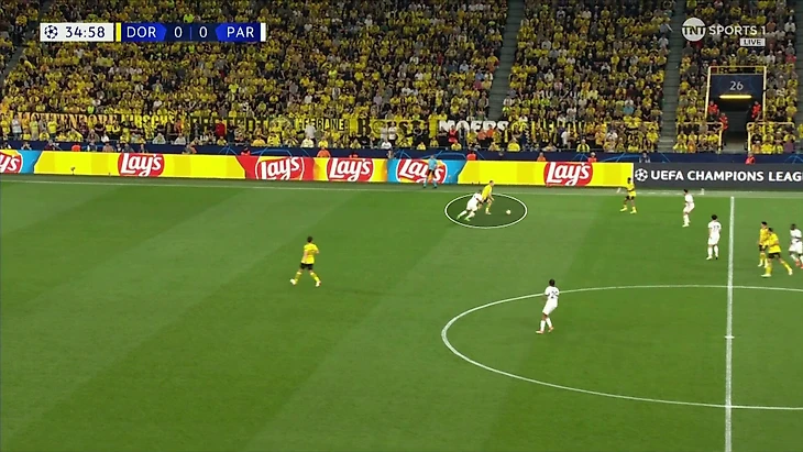 Совместными усилиями «Дортмунд» и «ПСЖ» очень качественно кормили Джейдона. Но были моменты, которые никак не касаются тактики и основаны на чистом великолепии. Тут Санчо после собственного отбора, собирает и накручивает оппонентов на своей половине: