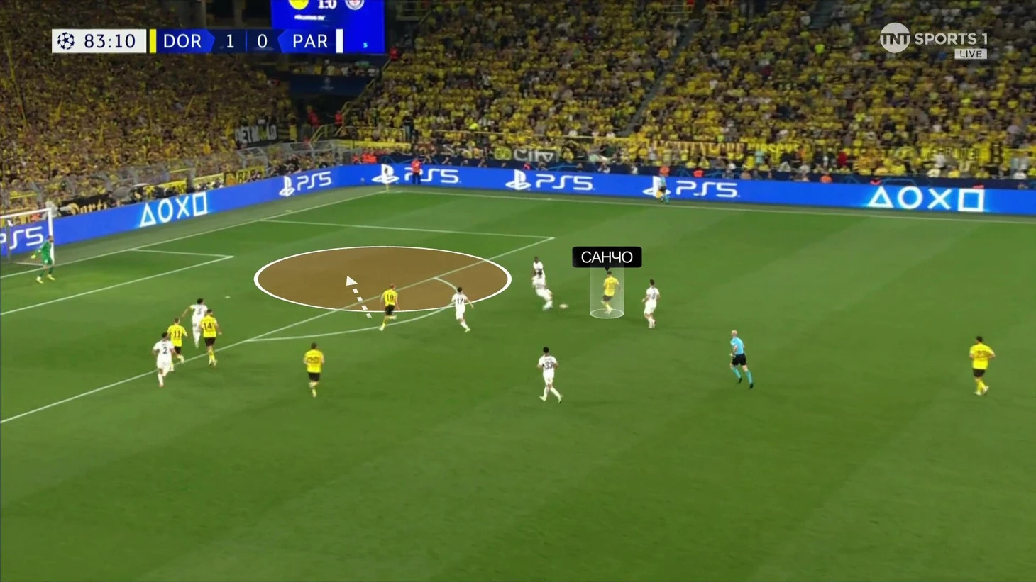 Еще один важный нюанс – траектория забега Санчо закрывает пас в центр на Руиса. «Дортмунд» не оставлял «ПСЖ» пространства за спинами защитников, закрывал центральное направление и не давал игрокам с мячом долго думать. Результатом стали перепасовки с высокой точностью (91%), но без высоких намерений.