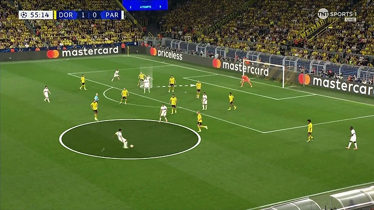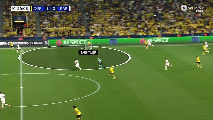 Во втором тайме «ПСЖ» пытался преобразовать давление, но дыра в прессинге лишь сместилась, а не ушла. Здесь Руис давит на Рюэрсона, а свободным становится Забитцер. Зона разрыва – снова фланг Санчо:
