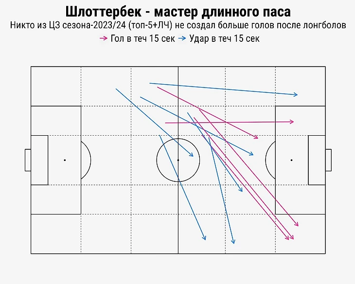 Вторая дыра была в конкретной дуэли – Шлоттербек против Мбаппе. Формально тут никого не оставляли свободным, но на практике против самого опасного пасующего центрального защитника этого розыгрыша ЛЧ действовал Мбаппе, который вяло работает в прессинге. Вот отличная картинка с обостренными дальними пасами Нико из канала Паши Тихонова: