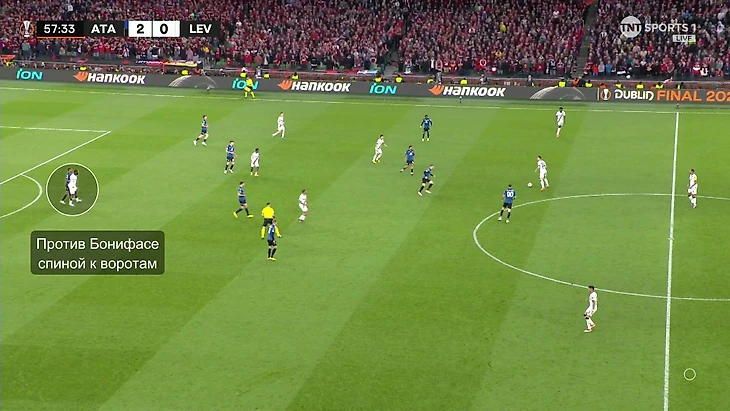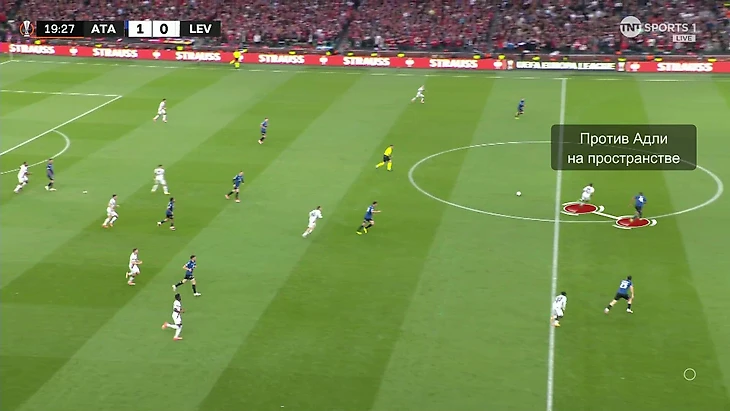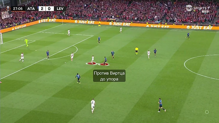 «Байеру» было очень сложно. Короткие розыгрыши уничтожала пятерка нападающих и полузащитников «Аталанты». Если спускался Виртц, за ним немедленно следовал один из центральных защитников. Если «Байер» выбирал длинный заброс, «Аталанта» выигрывала единоборства.