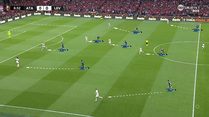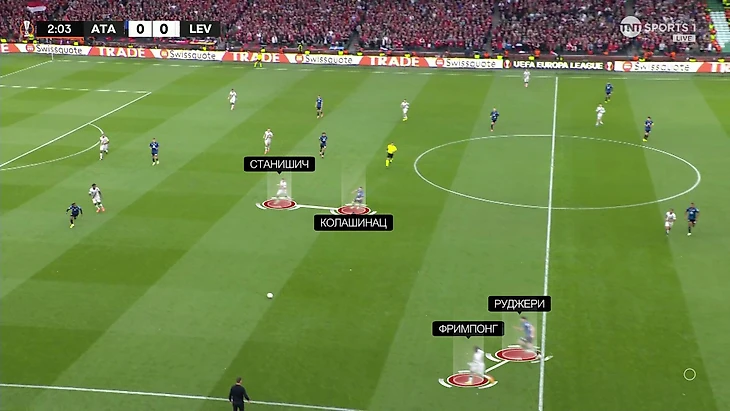 Изначально команда Алонсо старалась путать соперника в правой части поля – латераль Йосип Станишич при владении уходил в центр, а Джереми Фримпонг располагался в широкой позиции. От Сеада Колашинаца и Маттео Руджери требовалось внимательно передавать их. Еще пугали потенциальные забеги в зоне Фримпонг-Колашинац на пространстве. Давление на эту зону логично с точки зрения номинальных дуэлей, но на практике «Аталанта» была прекрасна и индивидуально, и в передаче игроков. Фримпонгу лишь раз дали фирменным образом проникнуть в штрафную.