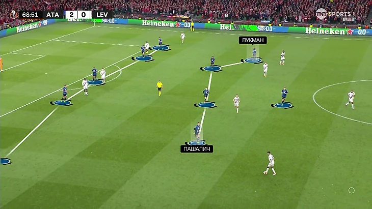 Важно проговорить: схема «Аталанты» 3-4-2-1 идеально накладывалась на 3-4-2-1 «Байера». Идеально для персональной опеки. У каждого игрока «Аталанты» была конкретная жертва, которую нужно съесть.