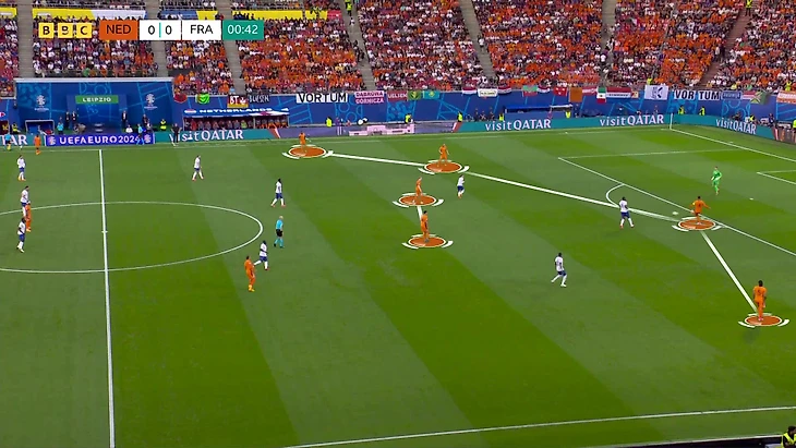 Номинально Фримпонг действовал как вингер, а Думфрис закрывал фланг обороны, но для структуры атаки это означало минус один игрок. В первом туре динамика зоны была совсем другой: Куман использовал Хави Симонса на фланге (со смещениями в середину), а в атаку максимально высоко поднимался Думфрис. Команда образовывала структуру 3-2-4-1 с высокими позициями фланговых игроков. Теперь же у Думфриса не было зоны, чтобы подниматься.