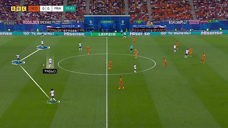 Из-за описанной выше стратегии Нидерландов у Франции часто было много свободных защитников в первой стадии. Привычная конфигурация – тройка свободных:
