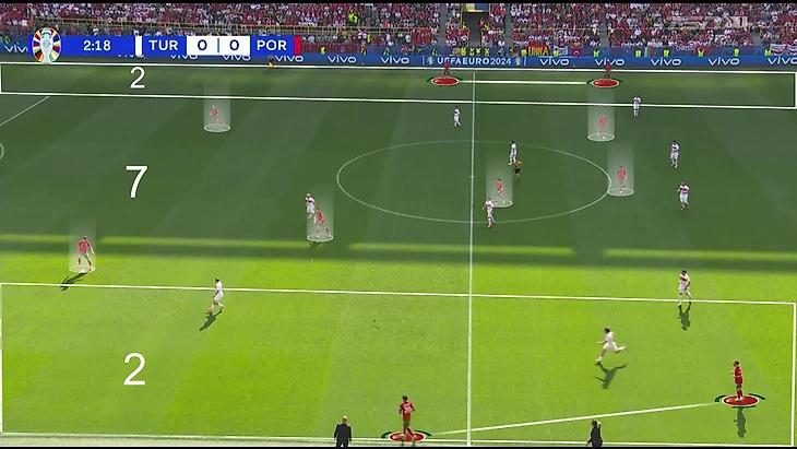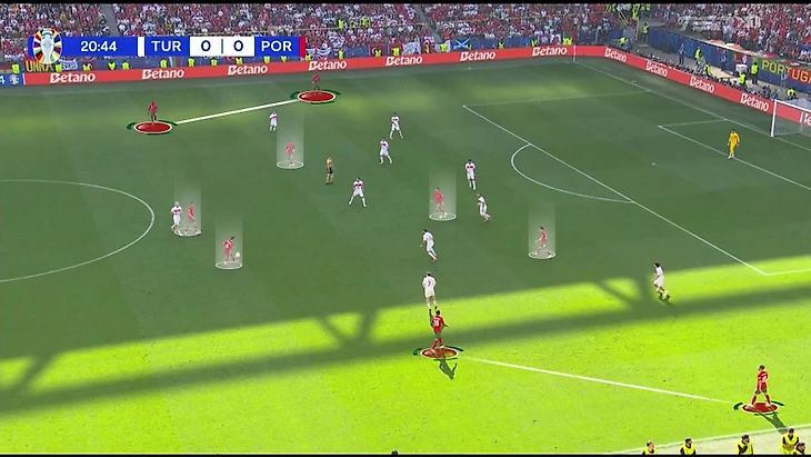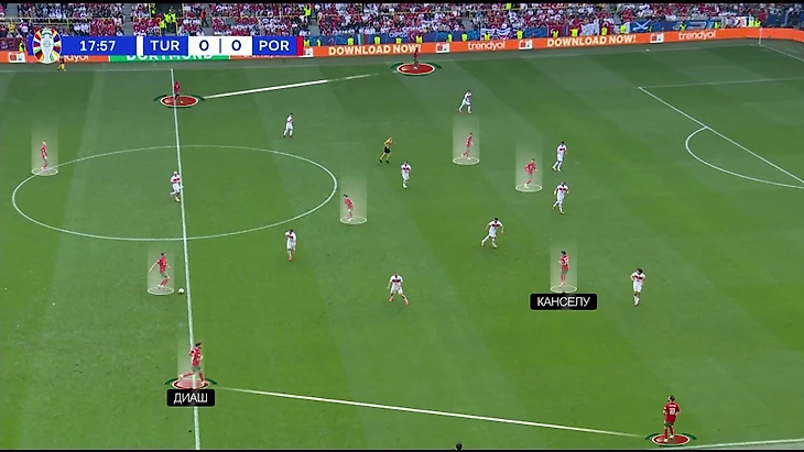 В редких эпизодах, где у Бернарду не получалось, выдвижениями реагировали Диаш и Канселу. Их задача была в чтении эпизода. Если Португалия справляется и вынуждает Турцию выносить, то они часть четверки защитников. Если в прессинге возникает дыра справа, они выдвигаются и становятся союзниками Бернарду по давлению в этой зоне. Еще по ситуации мог включаться объемный опорник Пальинья.