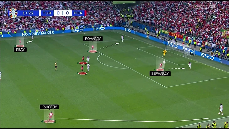 При прессинге Леау и Роналду стартовали в левом блоке и не покидали эту зону. Роналду не переключался между центральными защитниками соперника, а постоянно играл против правого центрального (Самета Акайдина). Леау действовал против правого защитника Зеки Челика.