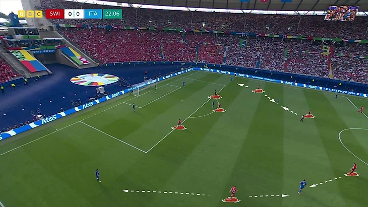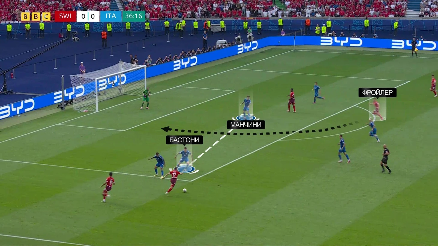 Мелкая, но крайне характерная деталь: к финальному этапу этой атаки итальянцы подошли с центральными защитниками на позициях, обратных привычным (Манчини – левее, Бастони – правее), а между ними образовалась огромная зона, куда и ворвется автор гола Ремо Фройлер: