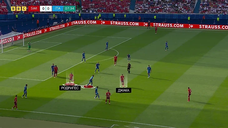 Для органичного взаимодействия в рамках такого футбола важно хорошо играть в пас и читать действия партнеров. Швейцарцы действительно прокачаны в этих направлениях. Пиком искусства стал первый гол в ворота Италии: 31 передача – рекорд Евро. Неординарные смены позиций и тотальная манипуляция схемой оппонента: