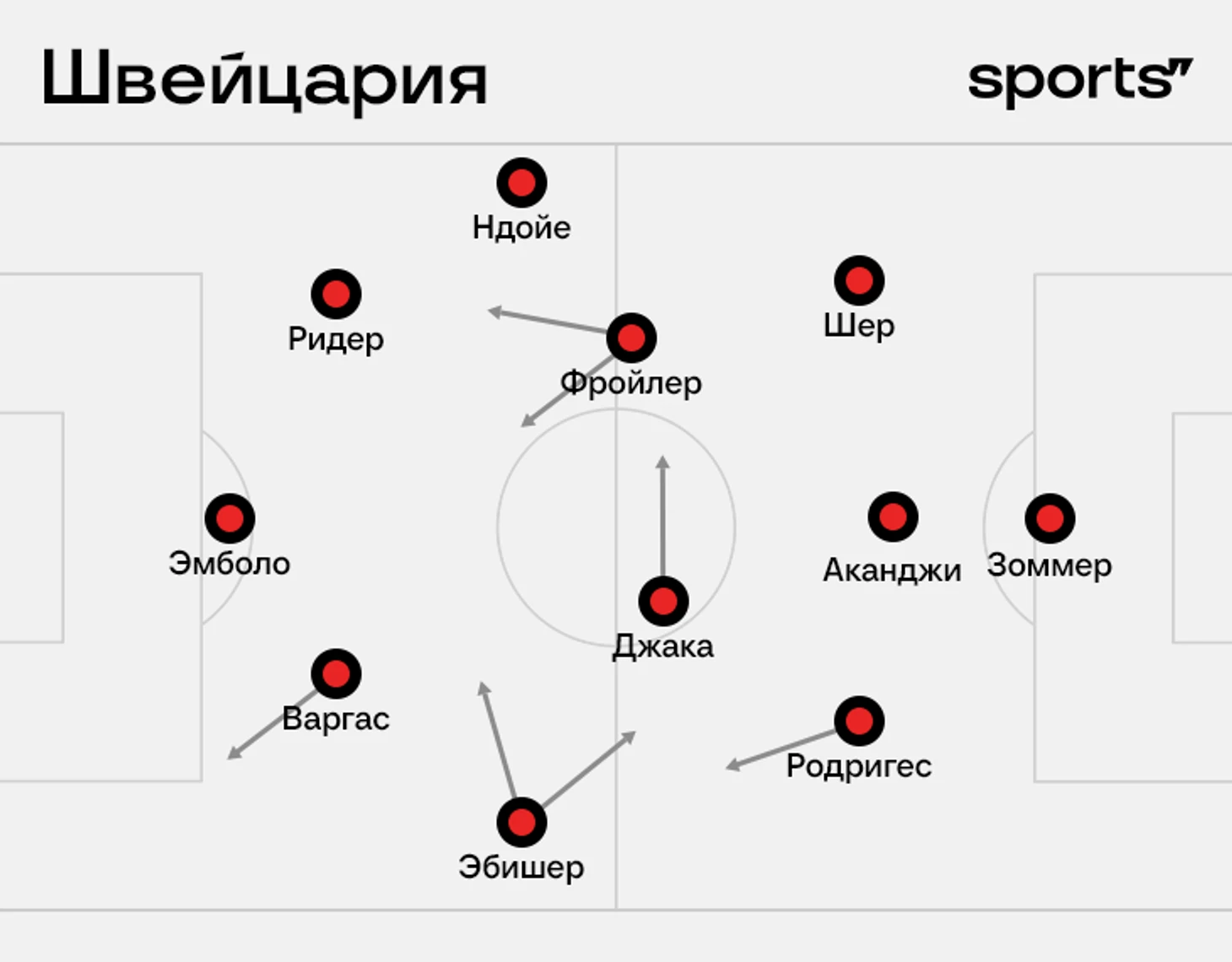 Швейцария не ротирует защиту и полузащиту, а вот атакующая тройка используется для адаптаций под соперника. Во всех матчах стартовал только Дан Ндойе – и то его позиция менялась трижды. Фабиан Ридер и Рубен Варгас сменяют друг друга. А позиции форварда – вообще главный инструмент влияния на команду.