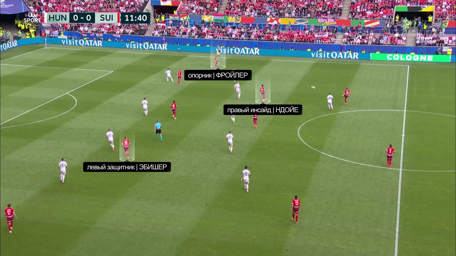 Стартовавший в первом туре Дуа дает открывания за спину. Шакири в этой роли – ложная девятка. Он помогает создавать перевес в полузащите, когда там нужно еще большее скопление игроков. Эмболо – вариативность. Он может и отходить в полузащиту, и играть спиной к воротам, и открываться за спину.