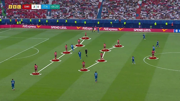 Только при 2:0 швейцарцы сами отошли на свою половину и контролировали соперника в структуре 5-4-1: