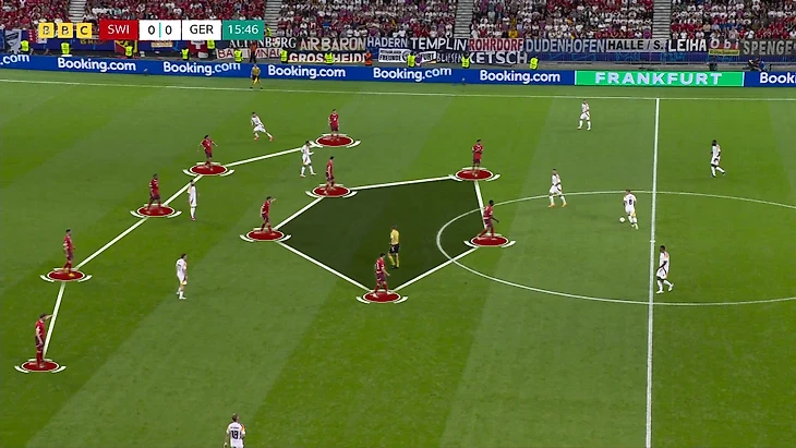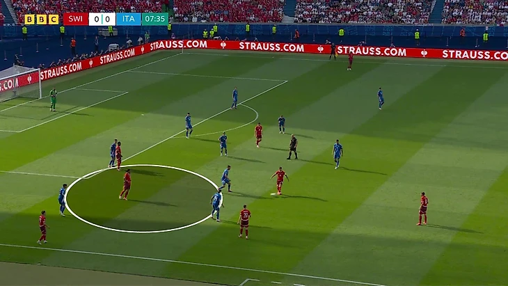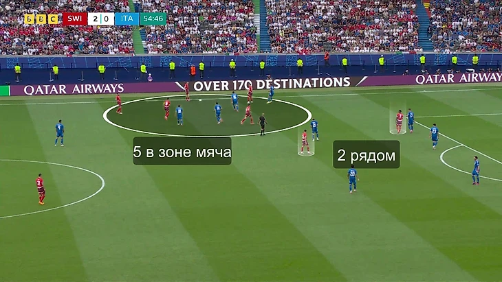 Речь не только про схему и Гранита Джаку: Швейцария очень похожим образом нагружает зону мяча, когда оказывается на чужой половине поля.