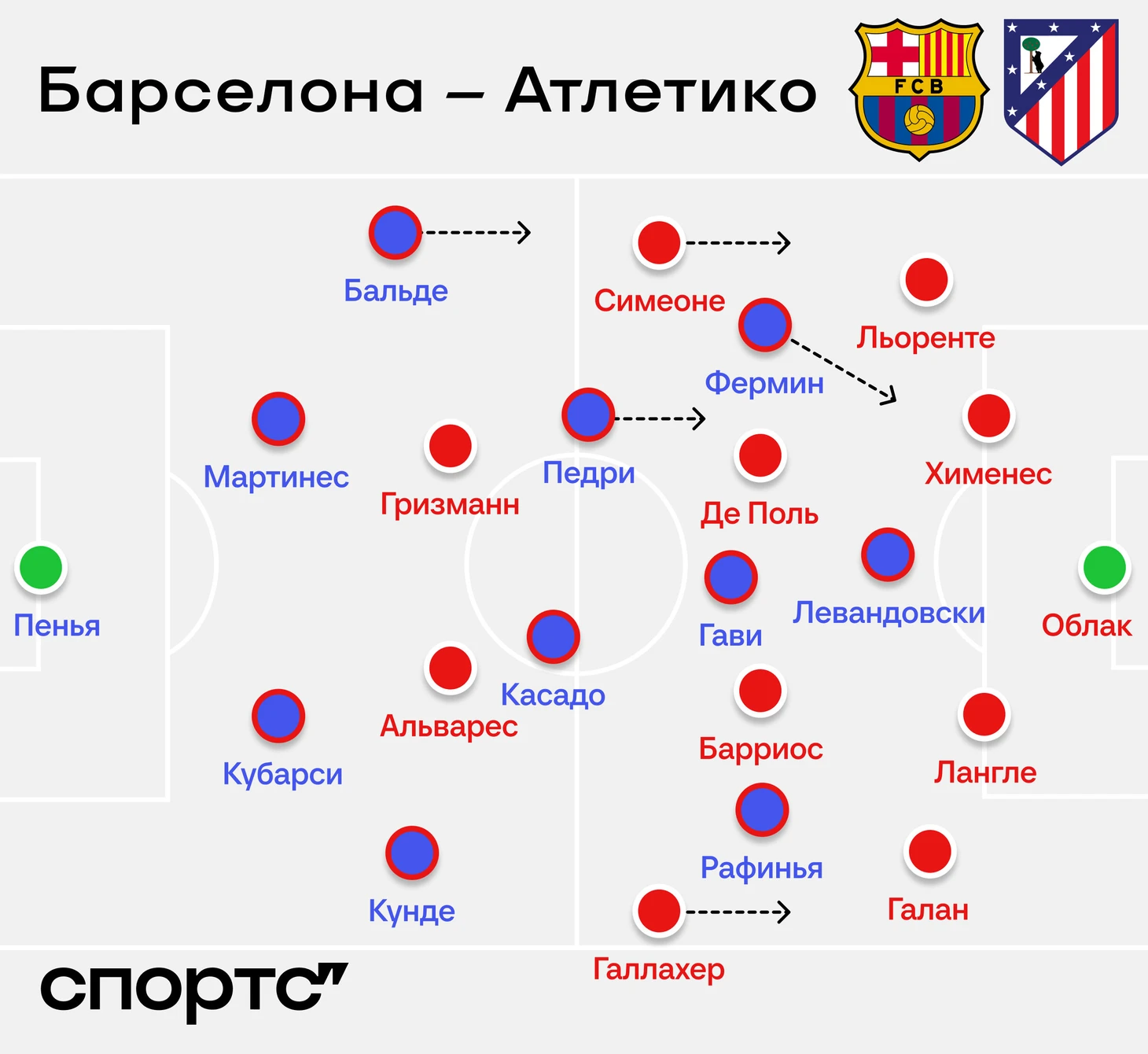 Ханси Флик выставил состав без Дани Ольмо. На его позиции вышел Гави. Травмированного Ламина Ямаля заменил Рафинья. В остальном – без сюрпризов. «Атлетико» подходил к матчу вообще без травм и дисквалификаций, а состав оказался полностью ожидаемым: