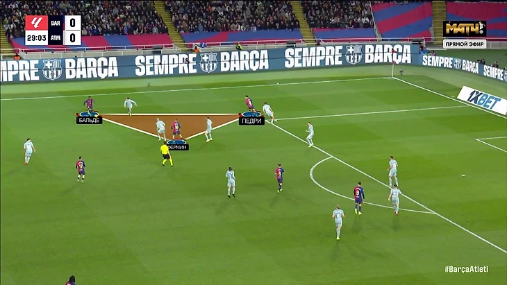 Слева у «Барсы» возникали Фермин Лопес, Алекс Бальде и Педри. Они менялись позициями – вытягивали на себя Симеоне-младшего и Льоренте, а потом комбинировали. Олицетворение этой идеи – гол Педри. Стягиваются к флангу и меняют позиции: