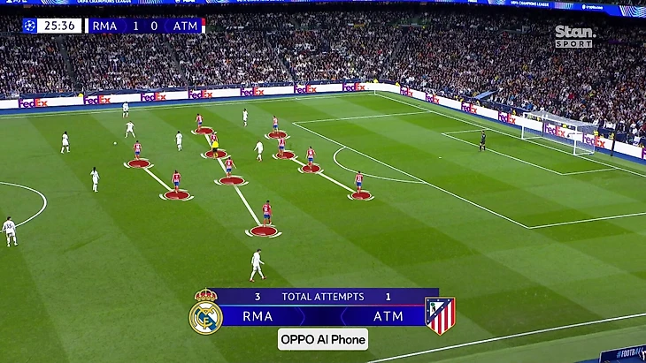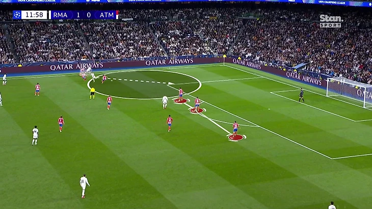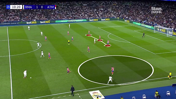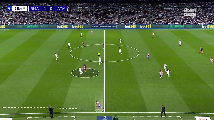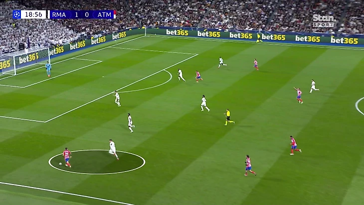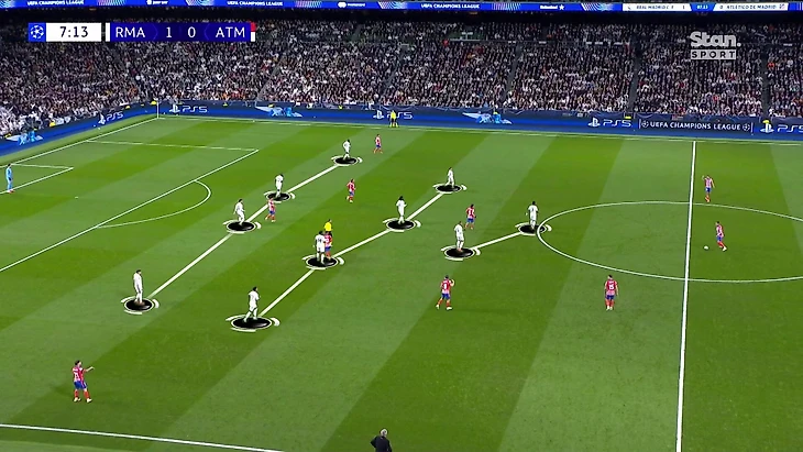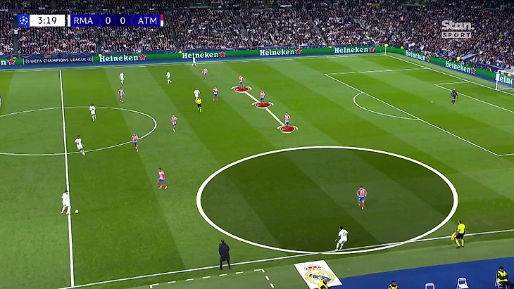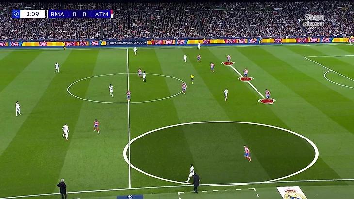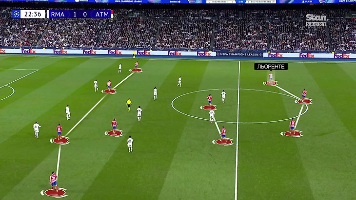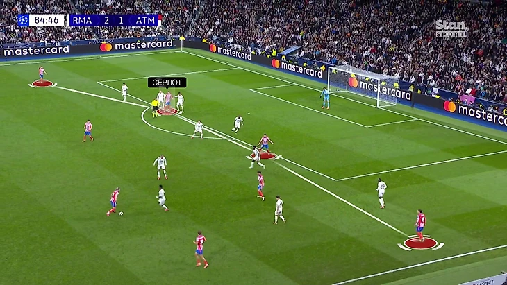 «Атлетико» оборонялся в схеме 4-4-2 без высокого цельного прессинга, но старался поджимать, когда мяч оказывался на фланге. В этом была формальная логика – прессинговать на фланге помогает боковая линия (у соперника меньше направлений для продолжения). Но на практике выдвижения не получались эффективными и своевременными, а футболисты «Мадрида» выигрывали индивидуальные дуэли.
