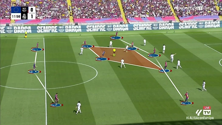 2. Если вингер с левого фланга разгружен, помогать против Ямаля должен кто-то другой. Например, один из центральных полузащитников. Тогда пугающим становится перевес в опорной, где «Барса» насыщает зону квадратом из полузащитников: