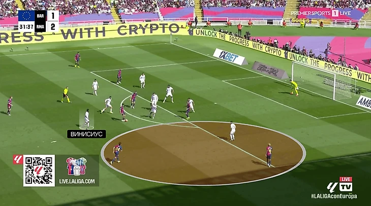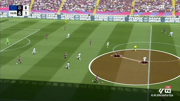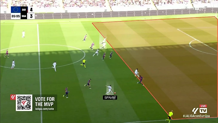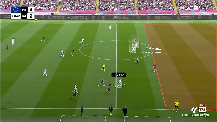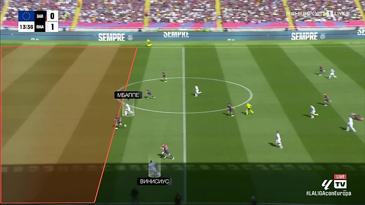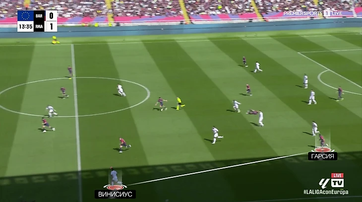 В обратную сторону тоже работало. Высокая позиция Винисиуса вела к двум типам проблем. Во-первых, Гарсия мог наказывать через собственные походы в атаку. Во-вторых, «Мадриду» из-за перекошенности схемы не хватало плотности в зоне Ямаля. Второй мяч «Барсы» – сочетание того и другого: