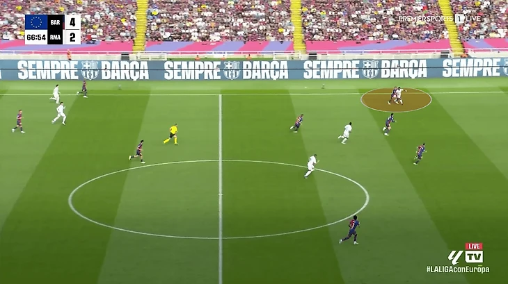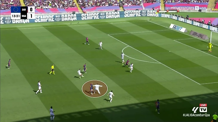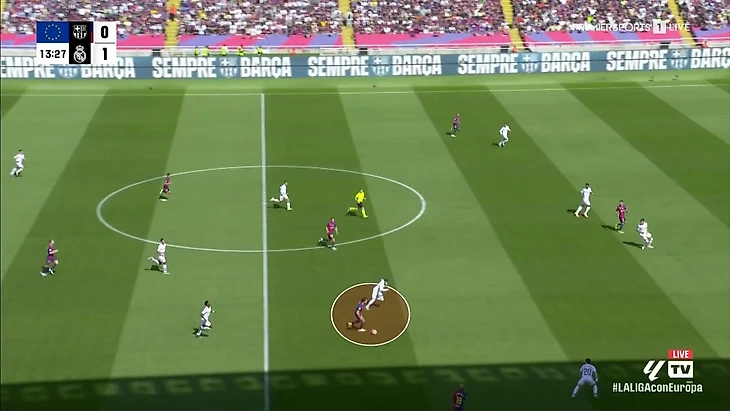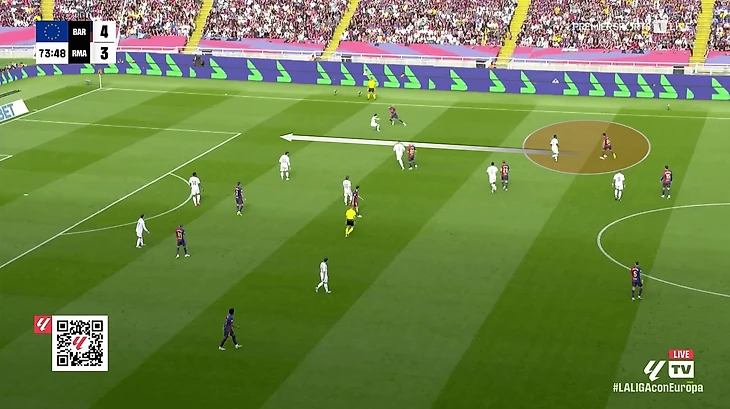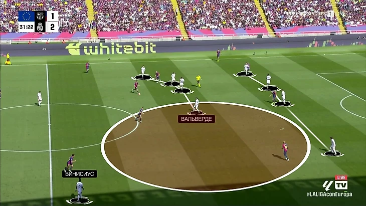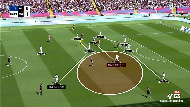 Заданием Вальверде было работать по всем, кто возникает в левой части поля. Дани Ольмо – его прямой оппонент по полуфлангу. Вдобавок нужно было держать в уме Эрика Гарсию в моменты, когда Винисиус его игнорирует. Еще было задание по подстраховке Франа Гарсии против Ламина Ямаля. А в свободное от этих занятий время надо помогать Себальосу в опорной.