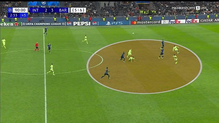 Концовка матча на «Сан-Сиро». «Барсу» устраивает результат, но за две с половиной минуты до конца безбашенные 4-в-4 сзади: