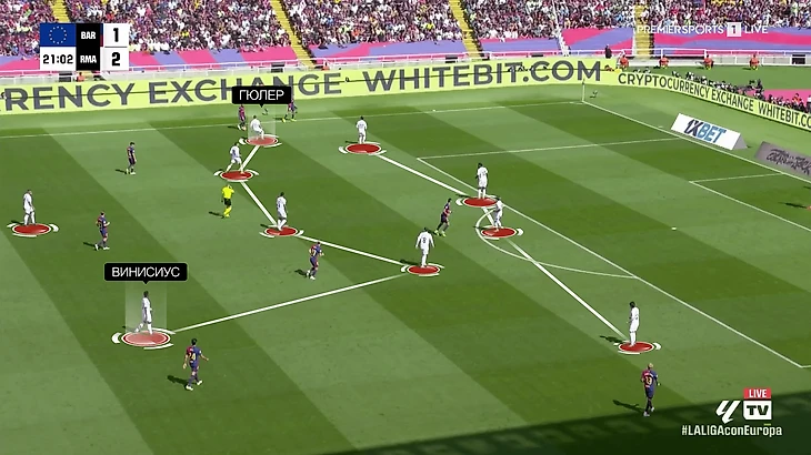 Типичный сценарий первого тайма: «Мадрид» защищается в схеме 4-5-1 (4-2-3-1), в которых Винисиус почти участвует в обороне. Иногда обозначает борьбу, но располагается выше играющего справа Гюлера и копит энергию для контратак: