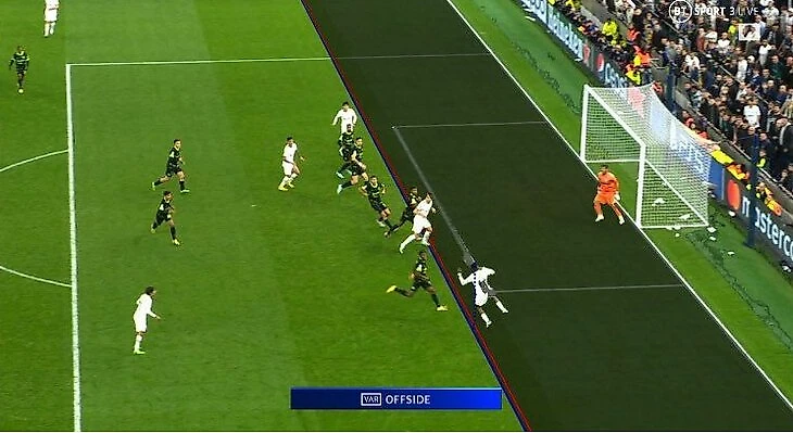 В матче «Тоттенхэм» – «Спортинг» ВАР-ассистентам пришлось рисовать вручную линии офсайда. Решение было принято верно, несмотря на то, что линия атакующего игрока (красная) была проведена по колену Харри Кейна, а не по стопе.