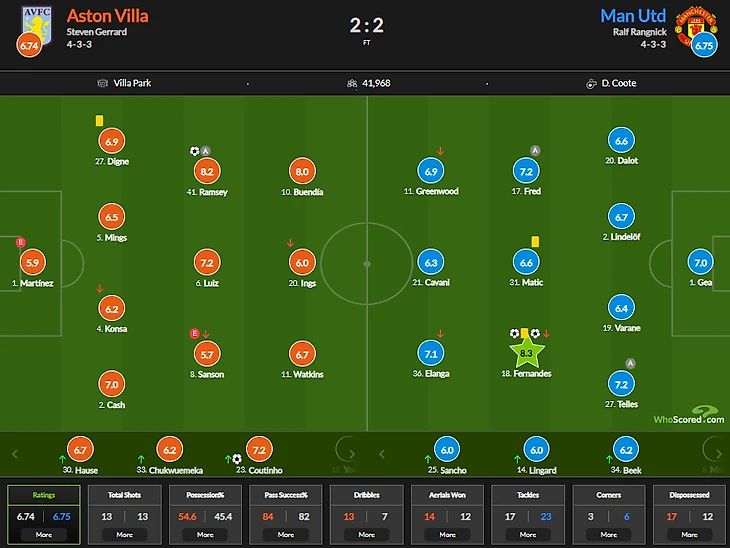 Сомневаюсь, что Джеррард рассчитывал на камбэк, но он рискнул. Чуквуэмека и Коутиньо сразу же сделали свое дело, а вот Рангник этот момент матча проспал, как и оборона МЮ два гола. Матич попросту не успевал чистить свою зону, а Фред играл значительно выше, часто застревая в атаке.