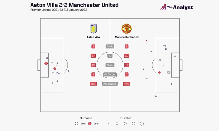 Например, МЮ вновь, как и против Кристал Пэлас, начал игру с контроля мяча и целостного давления на бирмингемцев. Первый гол, конечно, пришел из ниоткуда, сыграв на руку МЮ: команда меньше волновалась и мешкалась, что давало прекрасную возможность ловить Виллу на пространстве. Не знаю, было ли так задумано, но первые 30 минут от команды Стиви Джи являются совершенно провальными: игроки постоянно теряли мяч, не могли выйти из-под не очень активного прессинга, ни разу толком не подобравшись к воротам Де Хеа.