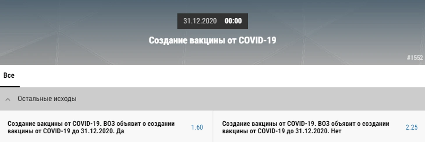 Решив вопросы столичной и национальной важности, букмекер принимается за вопросы глобальные. Следующий пункт — создание вакцины от COVID-19 ⚕