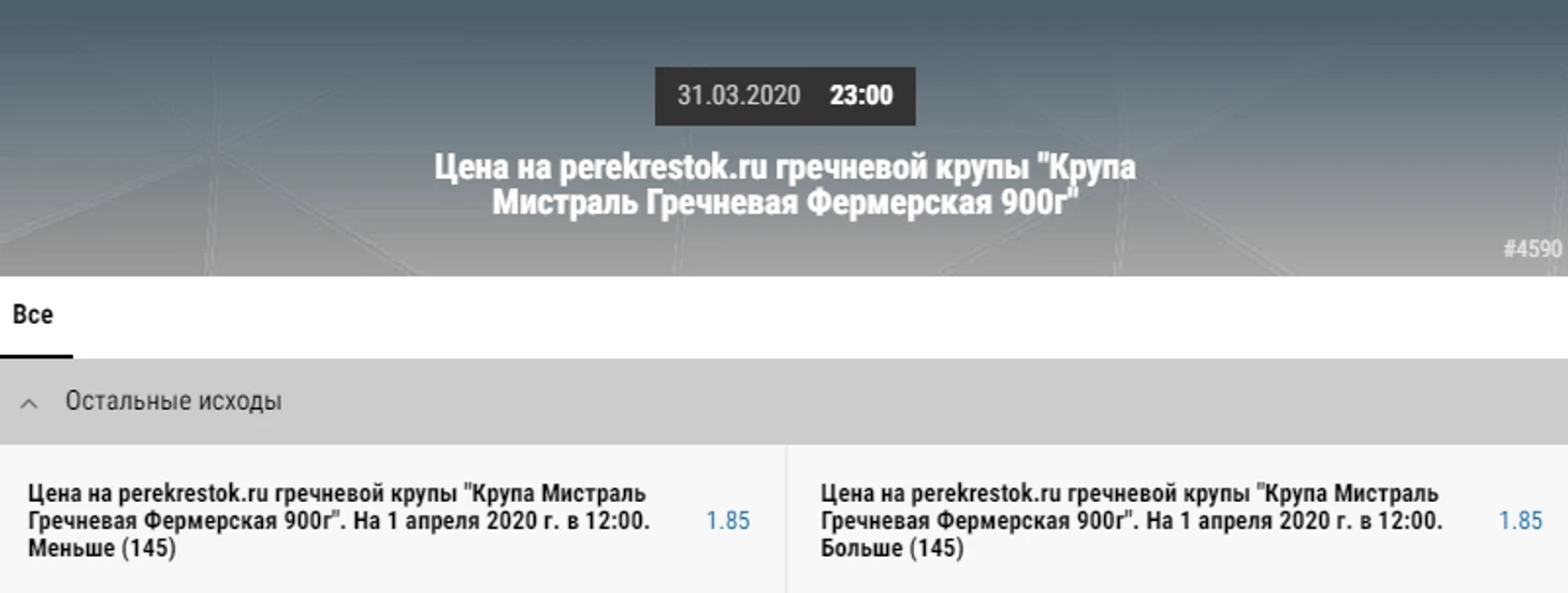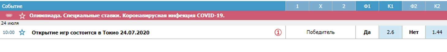 И наконец, еще одна букмекерская компания предлагает заключить пари насчет того, состоится ли 24 июля 2020-го года открытие Олимпиады. Конечно, не гречка и не заражение коронавирусом Ким Чен Ына, но тоже интересно. Сама букмекер в назначенную дату верит не сильно, так как коэффициент на положительных исход выше чем на отрицательный.