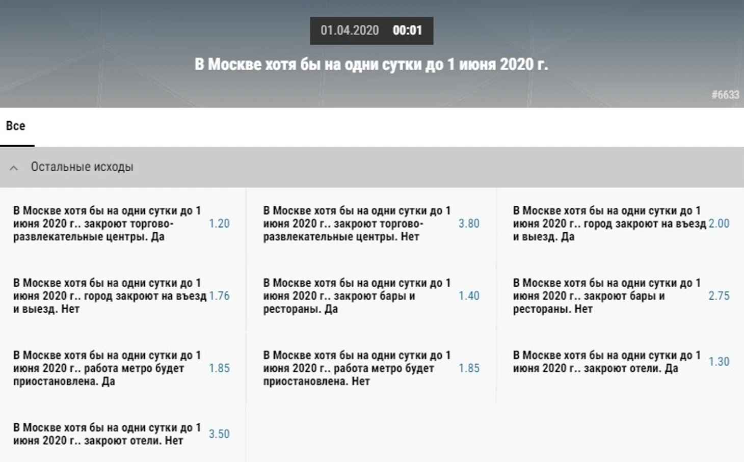 Второй букмекер, похоже, особенно обеспокоен жизнью россиян, так как большинство его ставок касаются угрозы COVID-19 различным сферам жизни в Москве и России в целом. Вот его рынки и ставки: