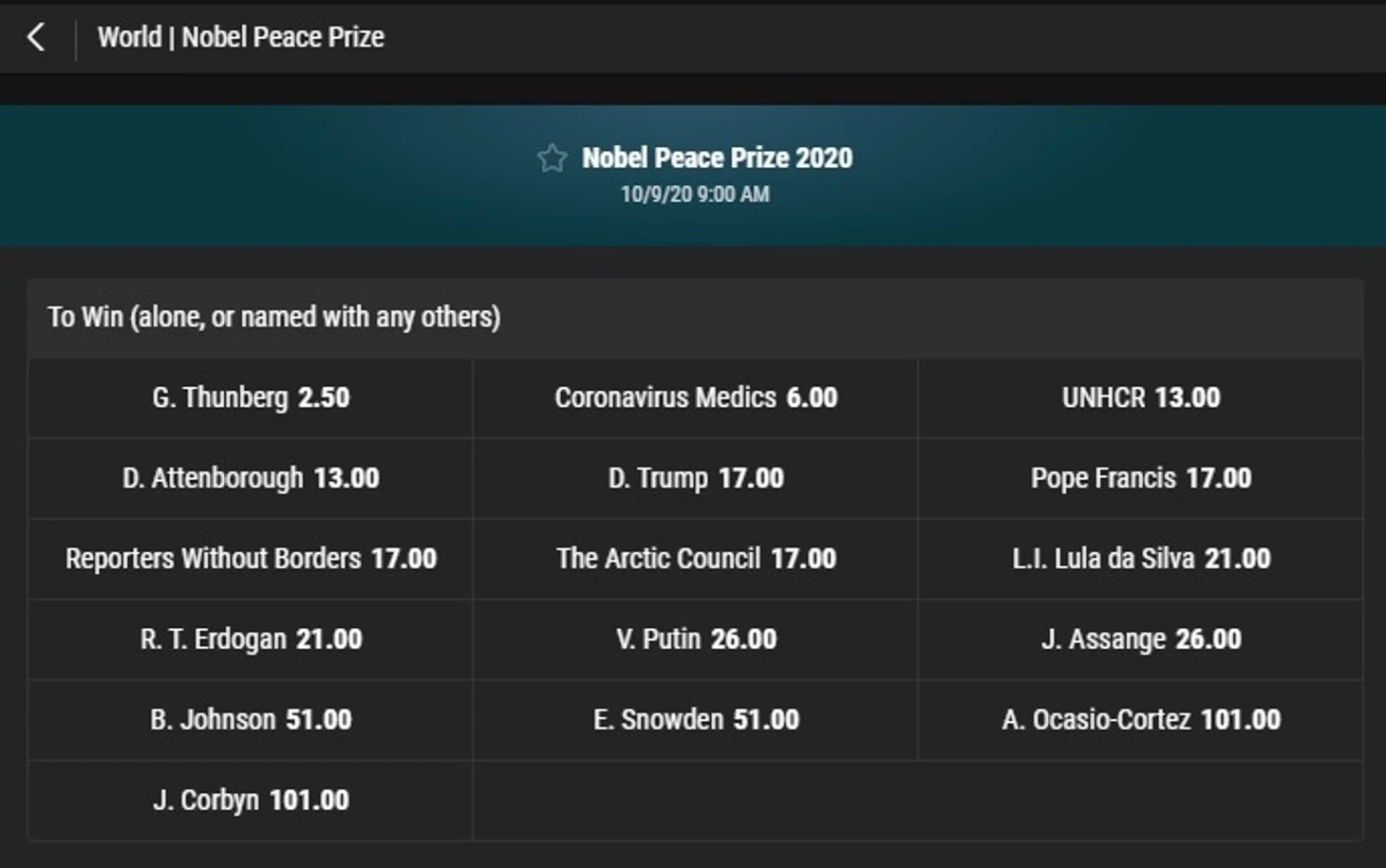 Один зарубежный букмекер оценивает шансы медиков, оказывающих сопротивление коронавирусу, стать обладателями Нобелевской премии 2020-го года. Как видим, их шансы получить престижную награду намного выше, чем у президента, Владимира Владимировича Путина. Коэффициенты на медиков 6.00, а на Путина целых 26.00