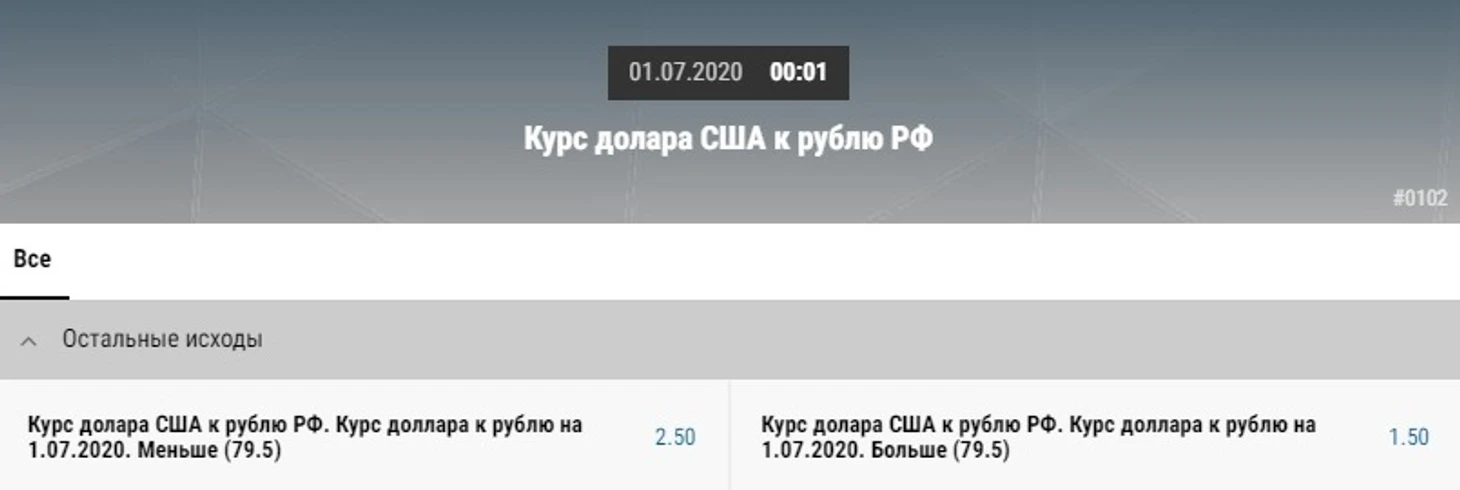 А потом тревожится курсом доллара США к российскому рублю. Игрокам необходимо предугадать, сколько будет стоит $1 на на первое июля (более или менее 80 рублей). Шансы на эти исходы он расценивает как равные.